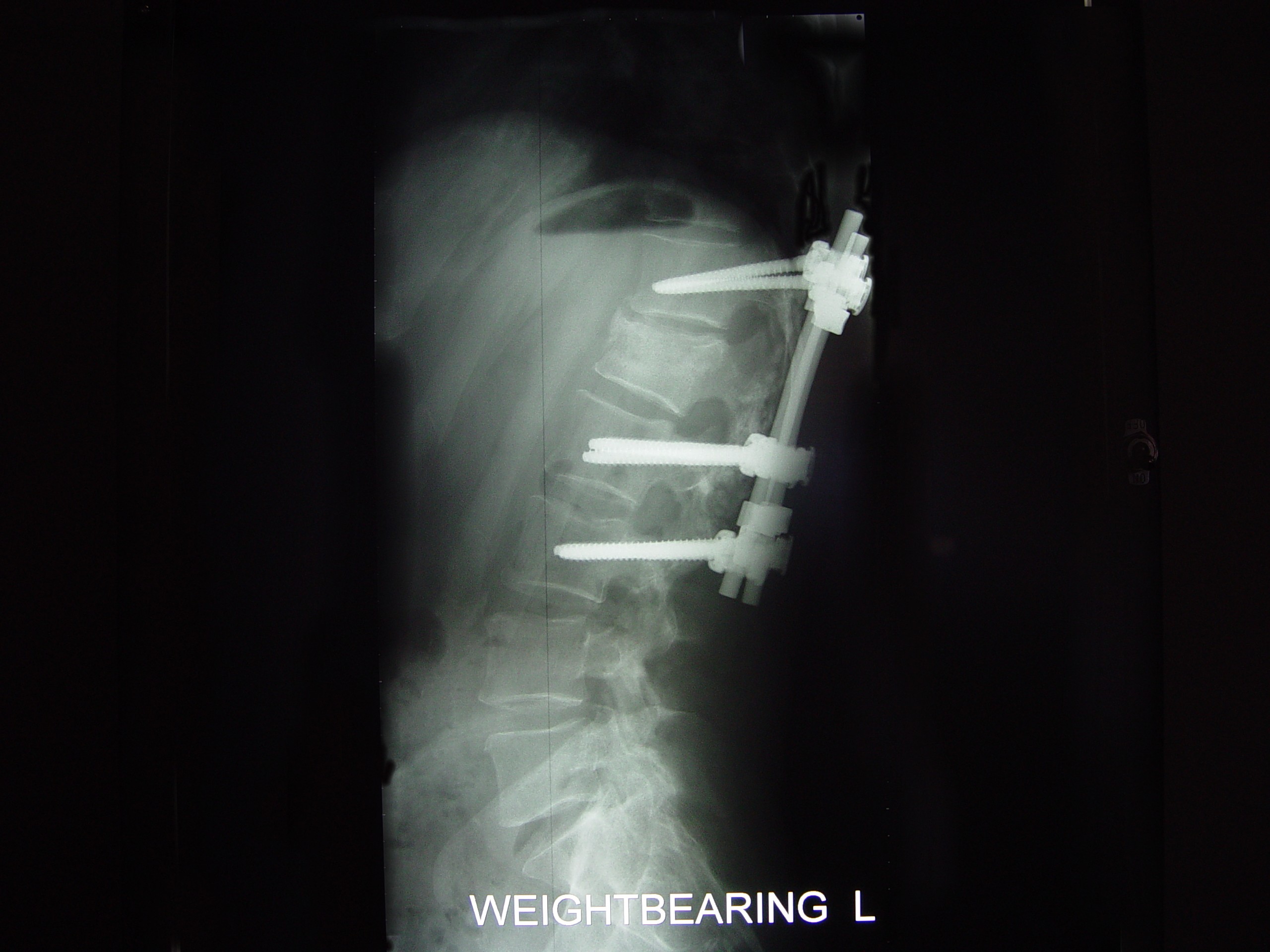 He has TWO rods in his back for support up and down... Two screws at the bottom of each rod and one at the top... He is in recovery at this time more than likely still...