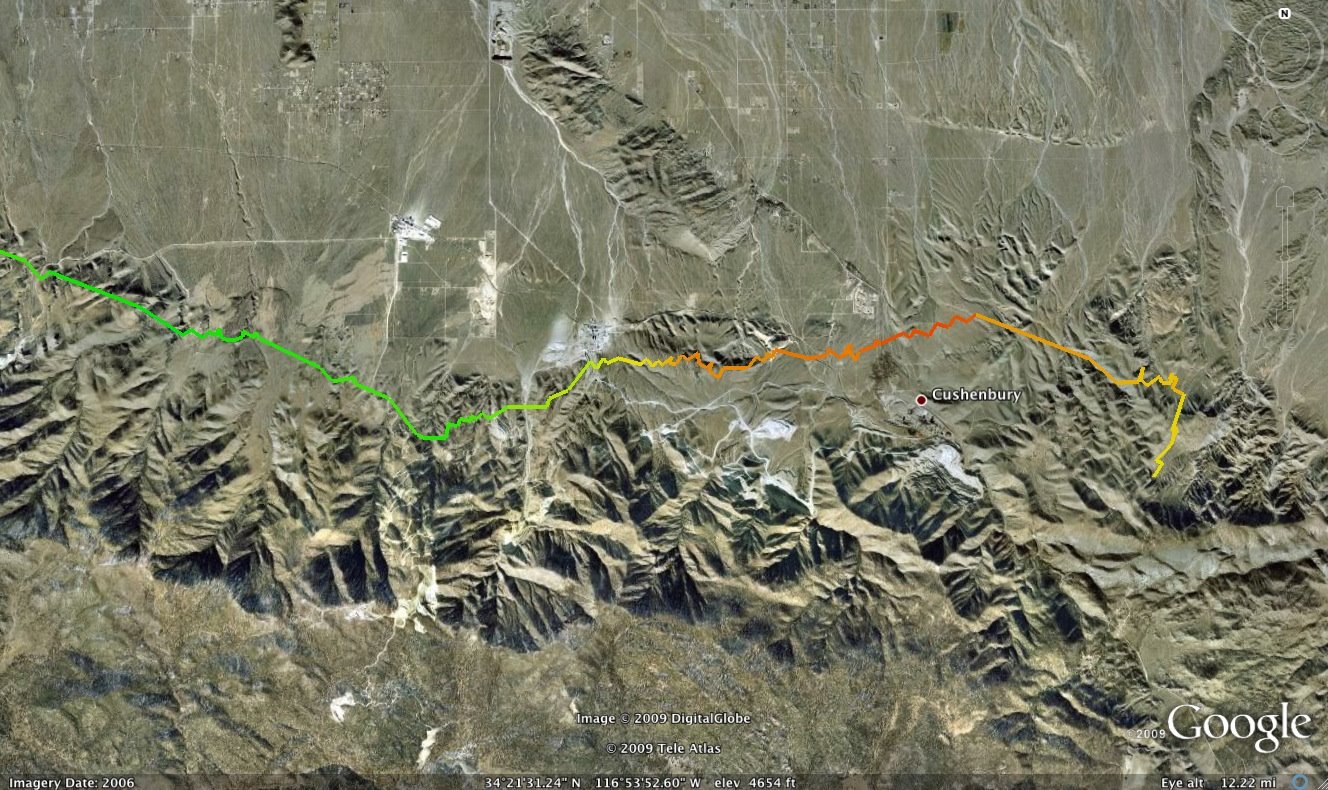 Strong on launch...12-20+ out of the East...made it difficult to connect...I opted to turn down wind once low and milk an area of lift drifting fast at the base of the mtns...covered much distance low over not so forgiving terrain...it was rock and roll in ridge lift - thermal mix on East faces...then scrub off downwind hoping to get higher...