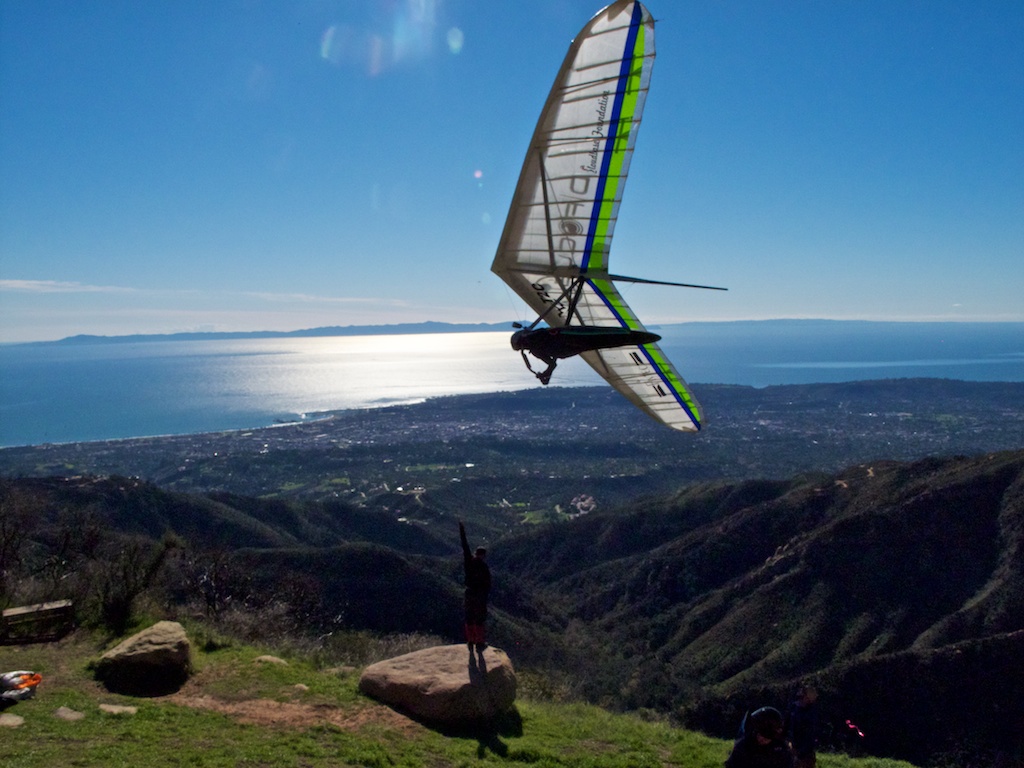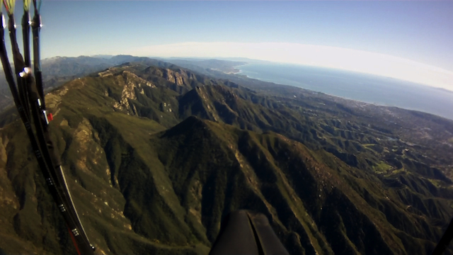 Awesome Fly-By shot Kabir ! Sweet flying conditions! Lots of smooth, broad lift out there. No East wind later on. Had a nice time climbing out at the Thermal Factory to start off while watching Zippy perform aerobatics out of the gaggle! I tried to stay clear but he snuck up on me from behind and flew just-under while looking back up at my owl eyes...I then went West to La Cumbre, S-Turned up the face with Kabir while Ty and Zippy turned circles out front, then onto Altermator for more climbing just out front. Out at the VOR with Ty low, Zippy was turning circles over the Bowling PIn letting us catch up...onto Painted Cave where I called it good while Zippy extended the turn point to Lizard's Mouth and back! :lol: Back East I had an unreal climb from No-Name drifting back to the NE hearing the gun club and fearing the richocet...managed to milk it to Alternator and float onto La Cumbre Saddle while Zippy dophined by skimming Earth thru the Saddle and kept going...I scraped it up the face of La Cumbre again and continued East not seeing Zippy again until Montectio figuring he'd tagged Romero already and was on the way back - course he was stalking and playing with me all along and did another great fly-by just-under while I was on glide to Secret Bowl, yes I was lifting my feet and they are normally out straight! We went to Romero road cut but the lift was slightly back West, we climbed out in sweet lift and off Zippy went to do Areobatics over Montecio peak while I cawled up Secret Bowl, after a nice S-turn session on Montecito, I flew out to the beach, not knowing where Zippy went...Mike Harrington on his way to pick up his glider, gave me a ride all the way back to launch for a sunset cruise. Thanks Mike! :D