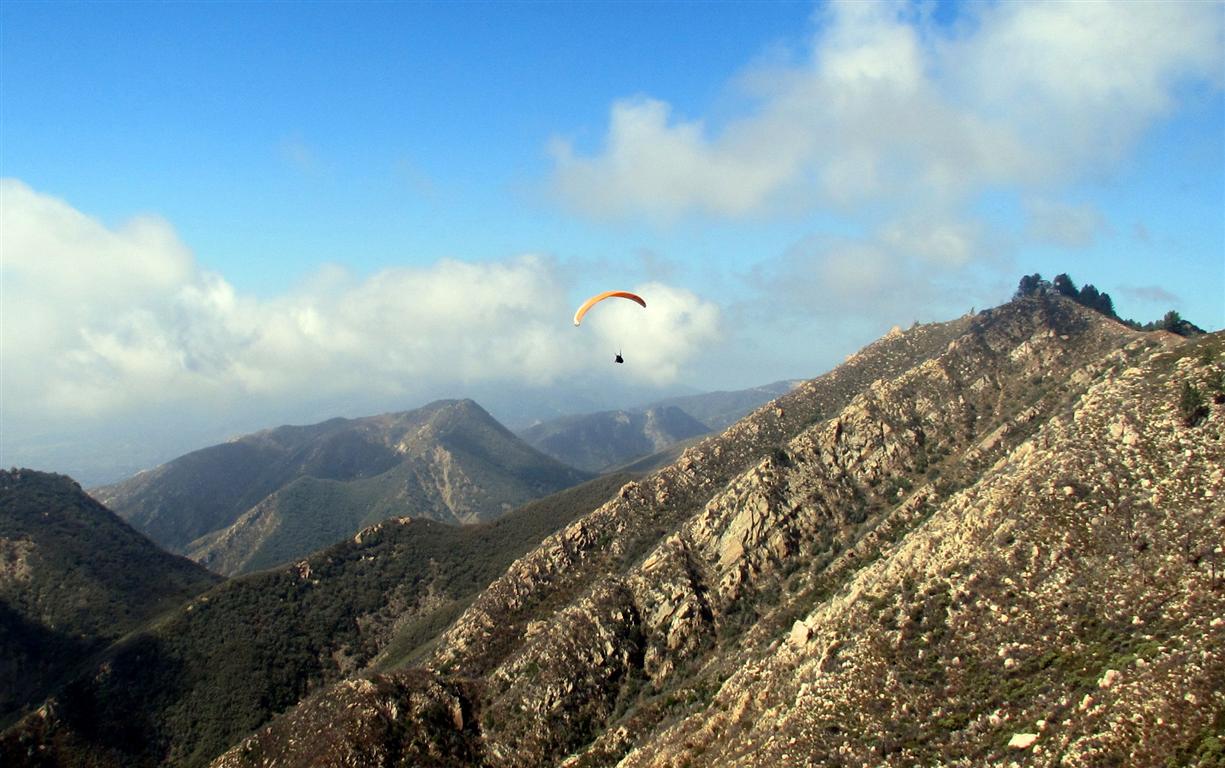Went to SB without checking the weather ( to fly the training hill if nothing else), and lucked into a really nice day. Caught the full Eagle Van just in time. Conditions on launch were perfect...clouds forming at 3500 out front and blowing in at ~10mph. I hit all the typical low points, crossing the power lines just below the ridge. Max altitude was ~4900 at West Divide and the Chief's spine. The thermals started getting blown apart as I went through Ojai. I lost my patience climbing up Santa Paula ridge, but was able to surf downwind across the face and make it to the Sespe river bed. 4 hrs.