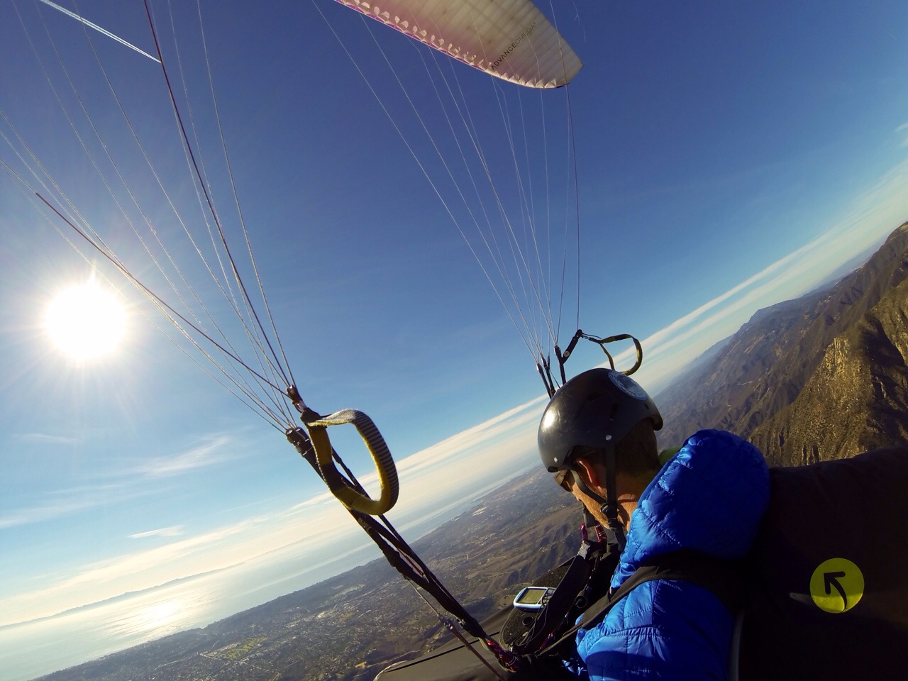 Took a loaded van with Kari and crew up to the VOR today. Had a great group from Seattle in town and a few of my own up for their first high flights. Not a stellar lapse rate but it turned out to be pretty decent! Brendan bounced over to West Bowl just in time for the sailplane to make a low pass. I was the last off and took the new Zero speed glider for a rip down to The T. Made it with 500 ft to spare, averaging 6.8:1 with a bit of a headwind! Brendan gave me a boost back to the van, thanks!! I headed off to Elings where the HGs were having a party, and the rest of the crew went for a late run to EJ. Kari made the beach, Robin went to SB HS, and everyone had beautifully buoyant flights to Parma. Fun day! We're doin' it again tomorrow!