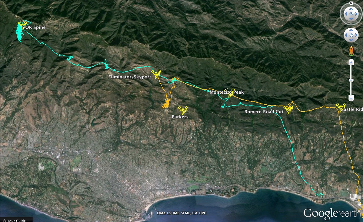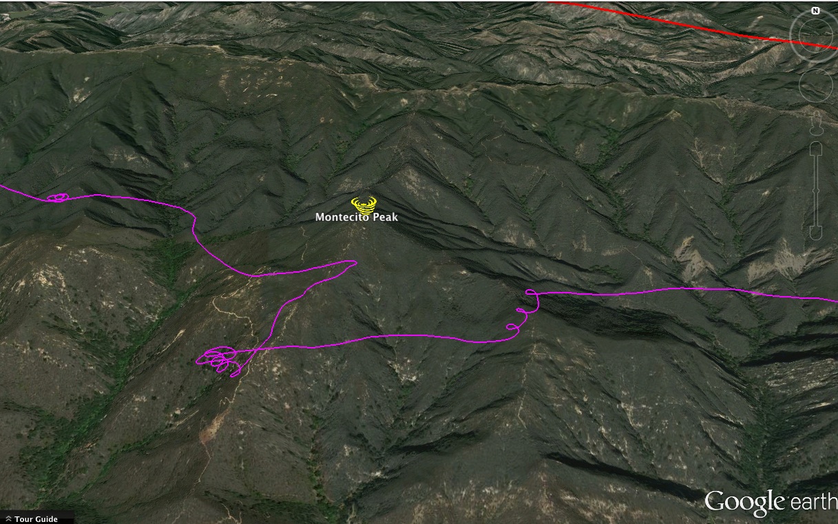 This Montecito Peak 'miss' really isn't a miss... as you can tell, I was ok with completely banking out front of the Peak (when I found lots of turbulence approaching it from the side)... then... once over the front, tried a brief small thermal, but decided to move to the next place likely... which gave me a little 200 foot climb, enough to get to the next setup...