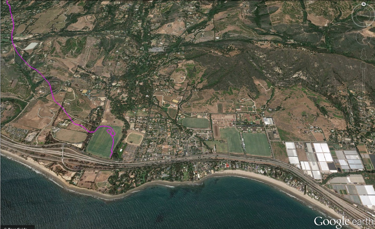 I was planning of going to Padaro, but just wasn't high or far enough. Time to be flexible. Fortunately, having a few outlandings, putting her into non-standard landing patches, etc... gives one confidence to know they can land anywhere below that is open... of course still very wary of all the factors... You know that you won't die... you'll just have to bunch up quickly and move off the premises... this is exactly what I did here on the Polo Field... clear, grassy bonus points, no wires, etc...