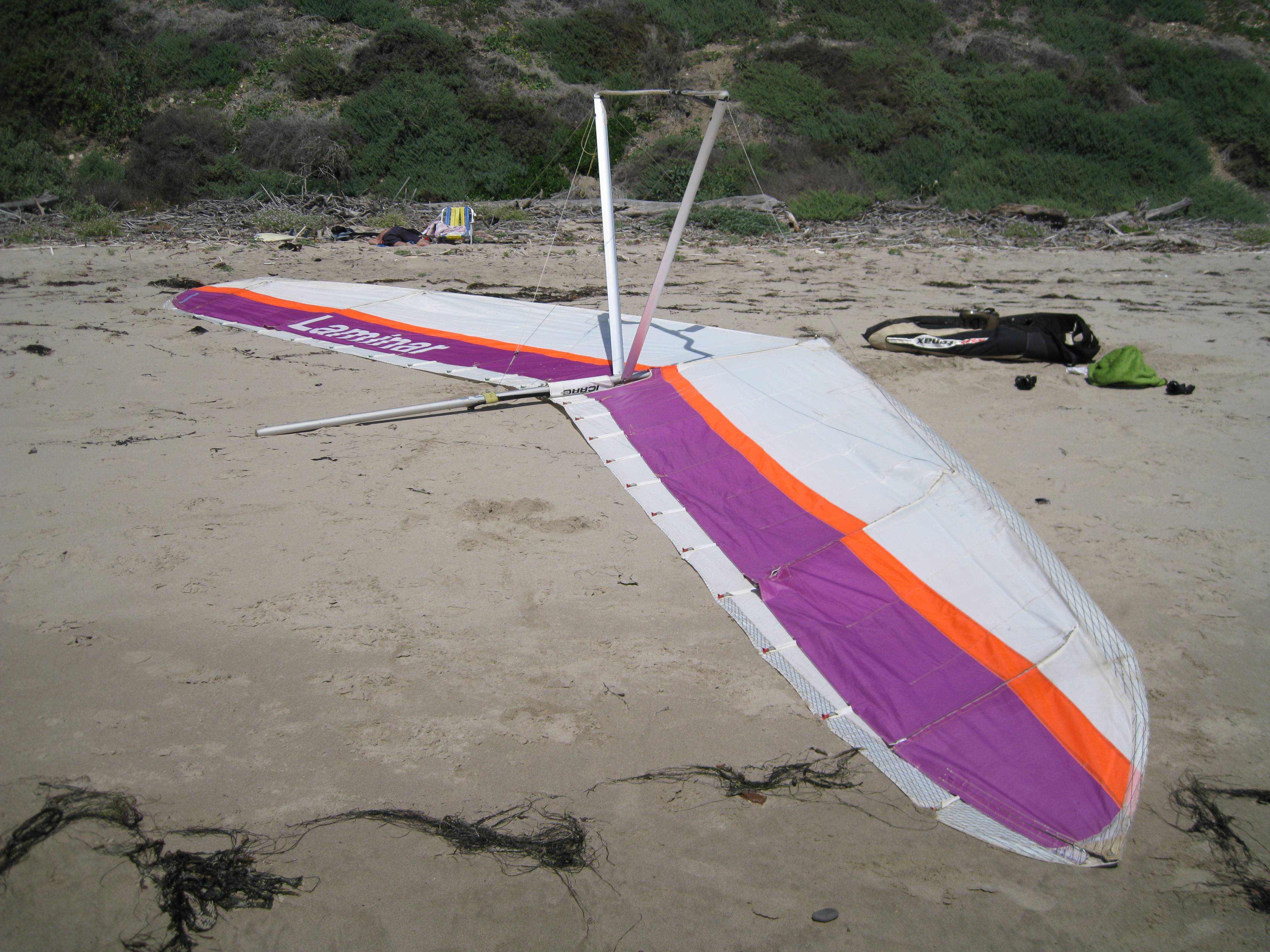 Nice conditions this afternoon today at Eliminator. As the north winds backed off the peak, the cycles were coming in lightly. No down drafts as clouds developed and pushed out overhead. Launched at 2:03. Found lift over Round House and Antenas to 3500'...pushed out to Lower Parma and worked good convergence lift to 4600' over Sycamore Canyon and Eucalyputus Hill...Turned down coast, dolphined with a 10 mph tail wind and made the bluffs at Bates with 750'...where it was light SE, E on the beach. Some edginess in the mtns, but not bad though, 1100 up and 1400 down. Many thanks to Marge for pictures and chase !!!