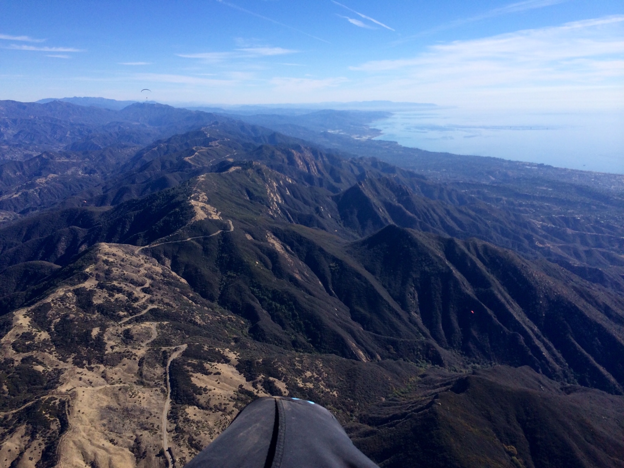 Arrived at the T to see a full van load of pilots and more cars pulling up, Rich jumped in with Dilly and I and we were off to the VOR. Good cycles coming up when we arrived and I was off first, followed by Chad, (I think he drove his own car too) Rich, and Dilly. Struggled a bit at first, but I found a smooth core to 5400. Chad took off eastbound while I waited for Dill. We left with 5200 heading eastbound to No Name, (but no love), so we kept going, arriving at West Bowl slightly above the top. It was pretty weak. Got stuck in front and below WB for 1/2 hr. then finally got above and benched back to the Alternator. Met up with Bart @ La Cumbre where we got back up above 5K. Hit more east wind on glide to the RR so we just kept pushing on to the Thermal Factory. We could see Timmayy and Aaron pretty low @ Cito so decided to follow Ron out to East Beach. Packed up on the grass with Ron, Benson, OJ, Bart and Max. Got a ride to Parma with Max and Lauren (thanks Lauren!), then Bart boosted us up to the VOR for car retrieve (thanks Bart!). Finished off the day with Tacos for lunch. What a great day of flying with friends, and a personal best flight for Dilly in SB!