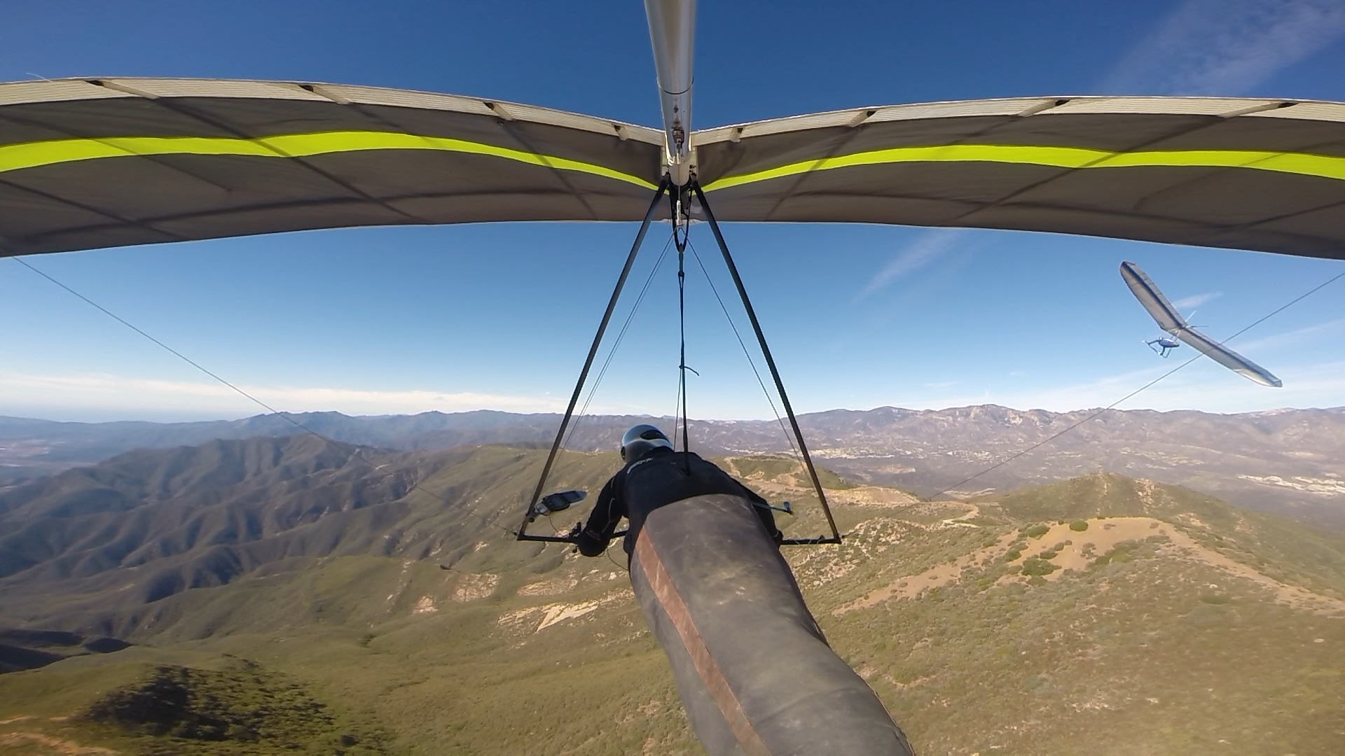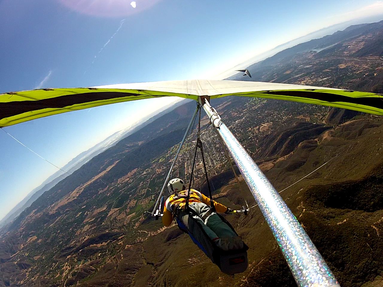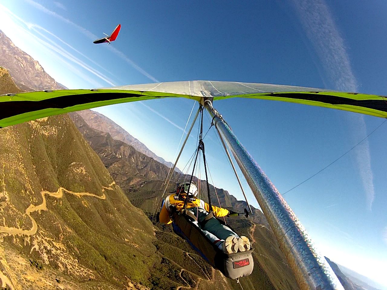 looking eastbound from the pass, Tom flying tandem w Peter