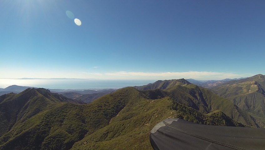 Getting soft in my old age. The plan was to land at the beach in Santa Barbara. But after struggling mightily to get above White Ledge the thought turned to any ole beach. Got to the west end of the powerline ridge in good shape, but after my experience in Ojai the thought was that continuing on might be a struggle, especially when I couldn't see anyone ahead of me. Opted to fly out. I headed for Santa Claus lane but it was too crowded to land so I turned tail to Bailard.