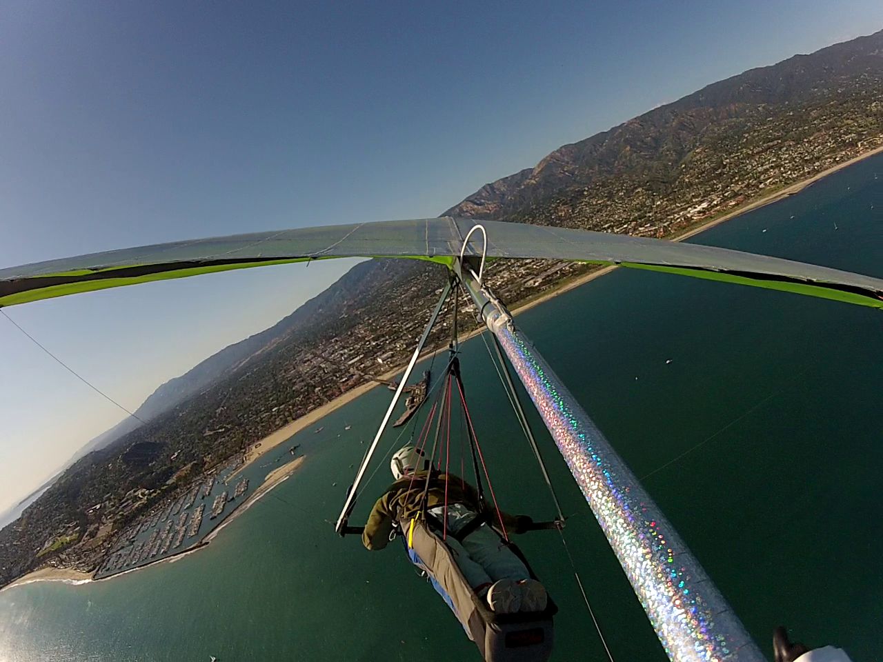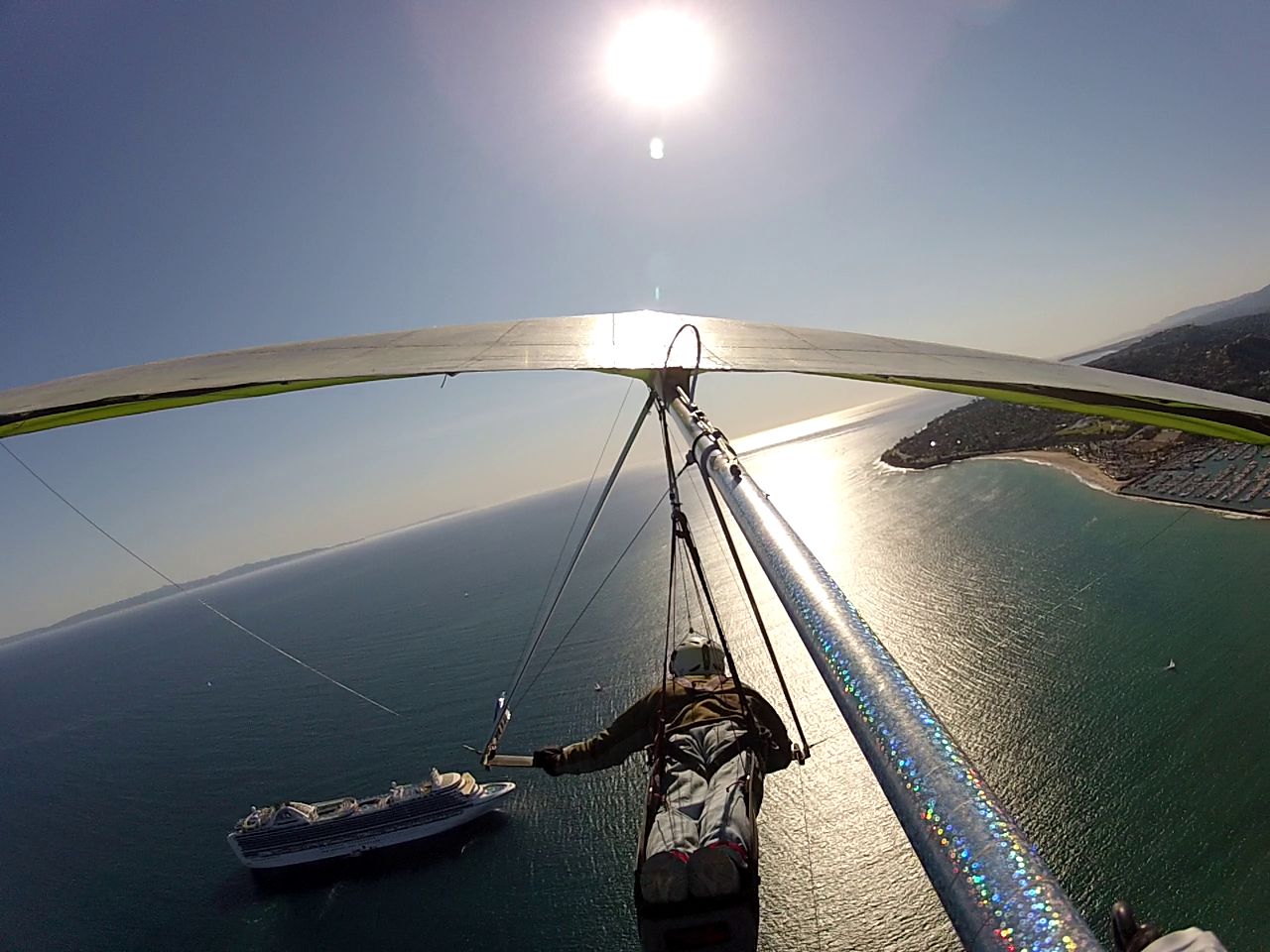 The glide back was pretty routine and by the time I hit the back of the antennae I was thrashed and decided not to complete the reverse course I had planned with hammer. Instead I had my eyes on that cruise ship a mile offshore. I glided as clean a line as I could muster and crossed the 101 at 1500 and headed straight for the Love Boat. By the time I saw 0.94 miles to Each Beach LA on my vario it was a 6:1 glide from 1000'. No sooner did I turn around that my sink alarm sounded off and my glide angle dropped to 8:1. Lots of fun over water in a harness you cannot get out of if you land in the drink. The procedure is to climb into the control bar and release the caribiner BEFORE you hit the water.