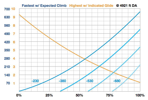 To arrive the soonest, with a given climb rate at the destination, find your expected climb rate in blue on the left. Follow it to the right to where it intersects the blue line that most closely represents your indicated sink rate at trim. Read down from that point to the Bar % you should use.