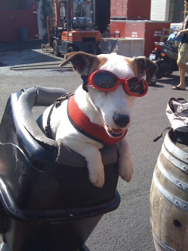Old dog can learn new tricks... This is my buddy's dog that rides in the back of his scooter with him... He is sporting his "doggles."