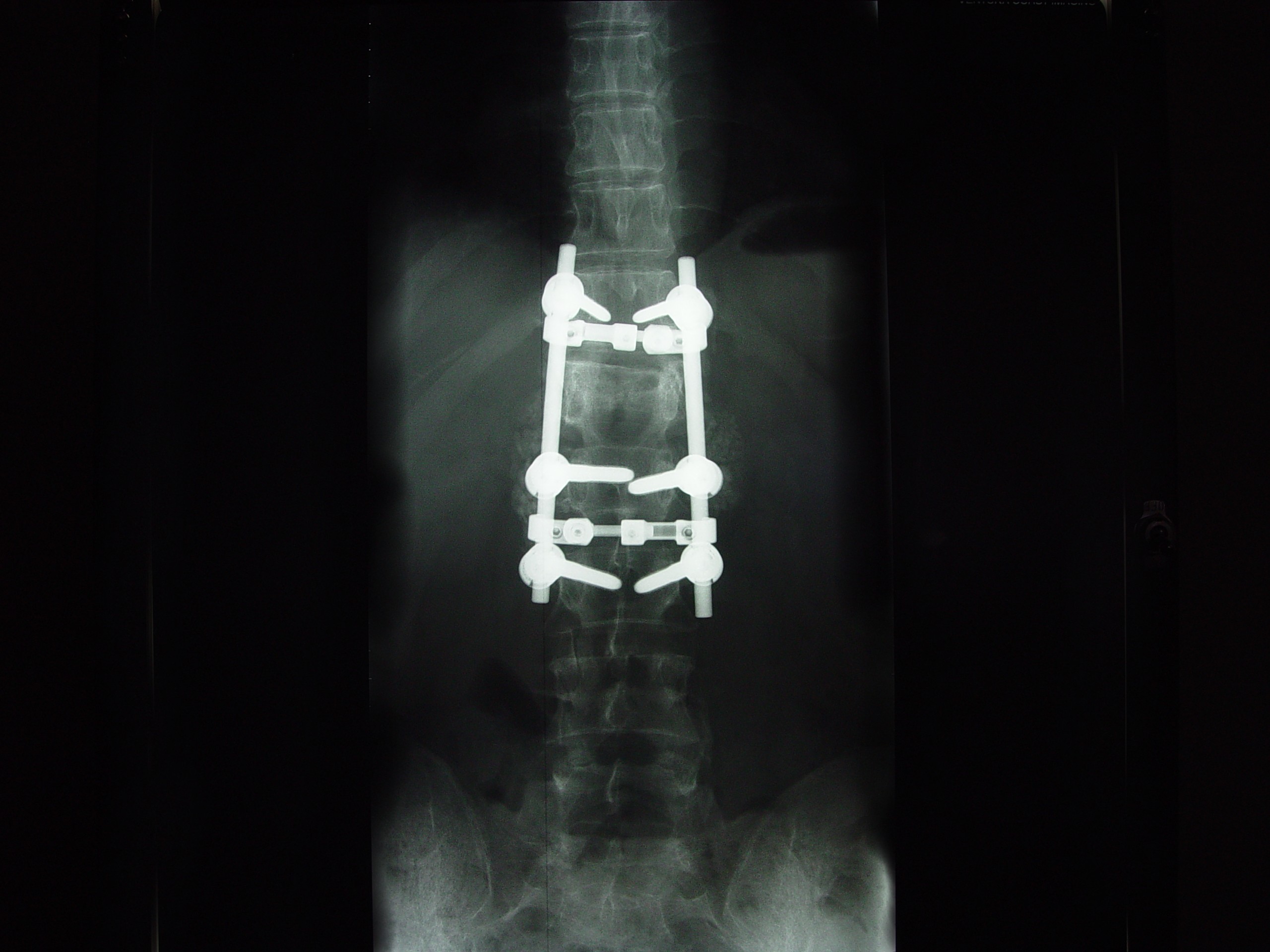He has TWO rods in his back for support up and down... Two screws at the bottom of each rod and one at the top... He is in recovery at this time more than likely still...