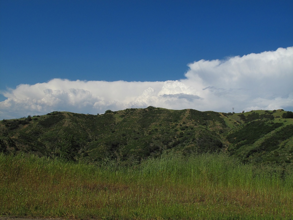 Although Tony Deleo takes the honors for the best flight of the week (see his post below), I thought Pine Mountain had one more good day to squeeze out of the recent unusual weather. Bob Peloquin took his Suzuki with me and an unnamed paraglider pilot - who may be a yellow-bellied coward, but who was unafraid to fly the backcountry in the face of towering thunderheads - as driver up to check out Pine for the inaugural flight of the year. The weather page had 9900's all the way up through 12,000 feet with a stellar lapse rate. The only problem might be the below-zero temperatures we would feel if we ascended to the BLIPMAPS' predictions of 16K. Well, the monster anvil-cloud that rose up over Lockwood Valley at 10 AM led to some pointed debate and hyperbole in the vehicle as we wound our way back up the 33 toward launch. Mammatus clouds added to the excitement. The aforementioned unnamed pilot demonstrated no fear as he calmly related stories of unbelievable horror that befell earlier, naive pilots in similar situations.