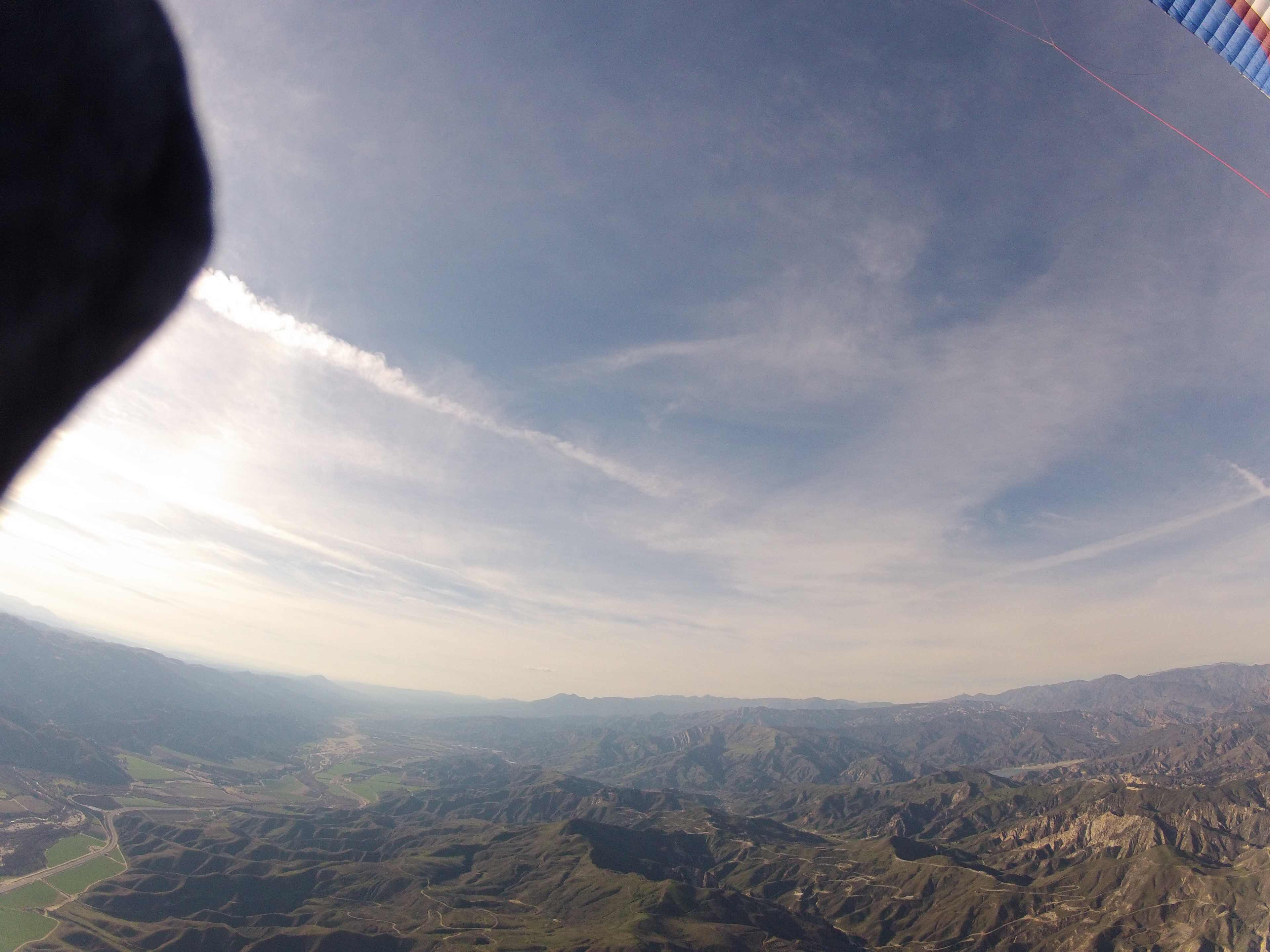 Less than a dozen of us rode in the Eagle van ahead of the FAA van. It was blowing in at both Skyport and EJ's. We started launching EJ's at 10:40 AM. I turned right to La Cumbre Peak and within minutes was near the wispy's cloudbase at 6,300 feet. I headed east and picked up Andy Dainsberg at the R&R. He can relate how he scrambled and hitch-hiked to make a similar launch time to mine. It only took seven thermals to make it through the pass to Ojai: La Cumbre, Montecito Peak (6,400 ft), glide all the way to Powerlines where Mr. Monster boosted us back to 7K, Noon Peak, Divide, White Ledge and Bump 2 - all in the high sixes. Andy took the back ridge after flying mostly out front to the Powerlines and I took the middle road. It was the perfect day with lift everywhere and a tailwind giving us ground speeds of 25-35 mph.