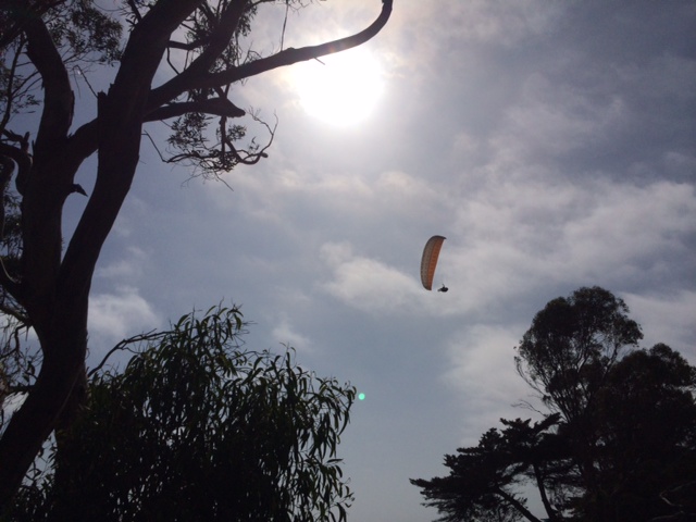 However, i personally had some great humility today that i think may be of entertaining light and i'm sure i bent some rules in my mistake, but whatevers. So i arrived at wilcox about 12:30 and it was light and straight, south south south eastish. took off and easily soared above the trees but not super high. the direction was incredibly straight so i cruised west and made it to more mesa where magic, dilly, jerry and alex were all enjoying the perfect zen moment. then i turned around and made it back to wilcox just as easy, never getting more then 100 feet about the ridge. with the sssse direction i have always wanted to land at the bar just south of leadbetter beach on a day like this. so i easily cruised up that direction and the light sssse kept me at least 100 feet above the ridge. when i got to shoreline kiddie park the kids were all going nuts as i was 100 or so over, so i waved and kicked and hooted back. Then i lost altitude rapidly and was very quickly below the ridge and hauling ass with a fat west tailwind. hmm, I thought it may have just been the spot so i pushed on thinking all would be good when i got to the east face of leadbetter just up ahead. i didnt make it that far and was over shooting the last small piece of beach(high tide) heading for a sure out to sea downwind landing where the surfers were at leadbetter(i was no longer above the ridge and would not be able to cut the corner to the sand at leadbetter). i tried to quickly hook back into the wind but only ended up further out to sea and thought i wouldnt be able to get it all the way around before hitting the water so i aborted and turned again back downwind with lots of swooping energy thinking i would try to get as close to shore as possible. i knew it was going to get ugly but i did have an acro wet dream of a moment when i saw my wingtip almost touch the water and i was almost perpendicular to it. then reality hit along with the abruptness of smacking the ocean hard downwind and my glory moment was gone. i tumbled a few times through the water and when i stood up i was thigh deep with lines wrapped around my head and torso. i panicked trying to get out of my harness as my glider was in the small surf and looked around as i thought i might need help. only one lady was on the beach in some yoga pretzel pose. i had made a big splash crash right in front of her and was worried about my glider pulling me under and she never even noticed. i guess that is the power of yoga. i eventually got my thousand pound glider and gear up to the rocks and half dry before dragging them around the point and up to shoreline park where Tye so kindly boosted me back to my car. I never thought i would land in the ocean, let alone crash into it. oh well, at least it was an amazing day. casualties of the pacific include vario, sunglasses, ripped glider, only speakerphone works on my iphone, banged up foot and tweaked back. i think i got off easy. love you guys and gals! see you up there and try to exercise your plan B before you no longer have a plan B ;)